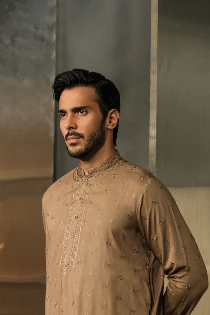 Apart from these shades, Bareezé Man has extended the collection with pink, green, black-green, white, off-white, blue, grey, and the king of all shades: black. Every kurta is designed with 100% cotton with unique embroidery. From single shade to two-tone, you will find it all. In addition, plain collar and cuffs with motifs on the entire fabric add a traditional touch to your look. However, embroidered cuffs and collar can make your moment extra special. The choice is all yours.
